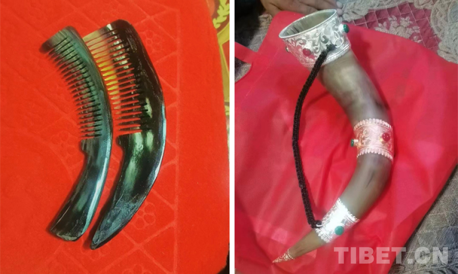 圖為麻木卓瑪管理站站長洛達用牦牛角制作的梳子和酒器?。暹_供圖)