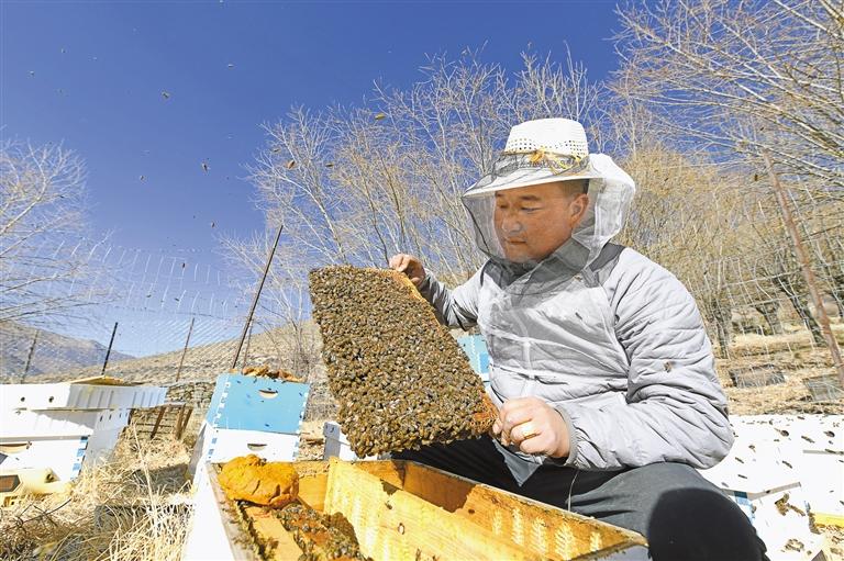 夜伴蜂聲西藏蜜蜂文化主題生態(tài)園位于山南市乃東區(qū)結(jié)巴鄉(xiāng)結(jié)巴村,是山南市第一個自然科普研學基地。近年來,園區(qū)以養(yǎng)殖基地、體驗基地、電商中心、生產(chǎn)工廠和科研基地五位一體模式,將蜜源植物觀光、蜜蜂養(yǎng)殖體驗、蜜蜂文化宣傳、蜜蜂美食產(chǎn)業(yè)有機融合,促進蜂產(chǎn)業(yè)與休閑觀光、鄉(xiāng)村旅游等深度融合,吸引更多當?shù)剞r(nóng)民進入養(yǎng)蜂行業(yè),實現(xiàn)增收致富。 圖為夜伴蜂聲西藏蜜蜂文化主題生態(tài)園的養(yǎng)蜂工人在換蜂箱。 本報記者 唐斌 攝