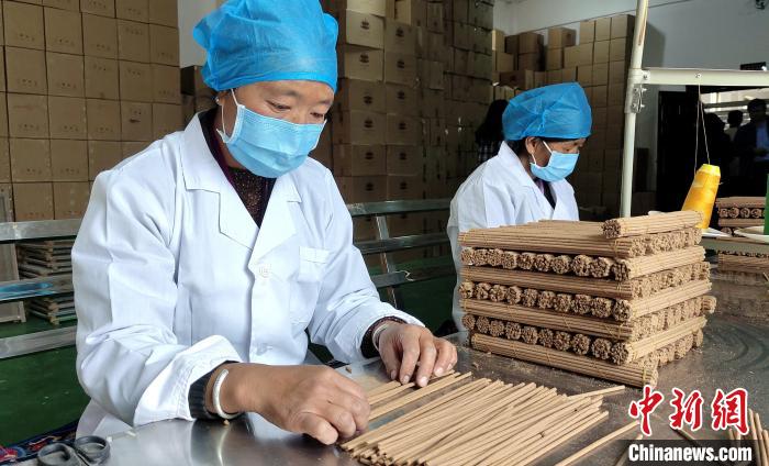 “我們農閑時就會來這里制作藏香?!睅孜宦耦^工作的婦女不善言談,但她們數線香、捆藏香流程十分嫻熟,她們足不出村實現就業(yè)增收?! ?/p>