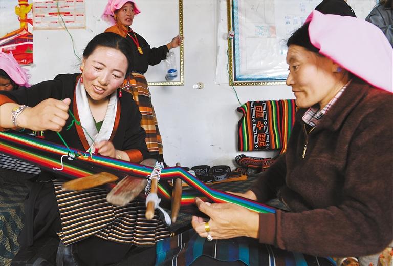 圖為木托村婦委會(huì)主任措吉卓嘎(左前)和合作社成員切磋編織技藝。新華社記者 張汝鋒 攝