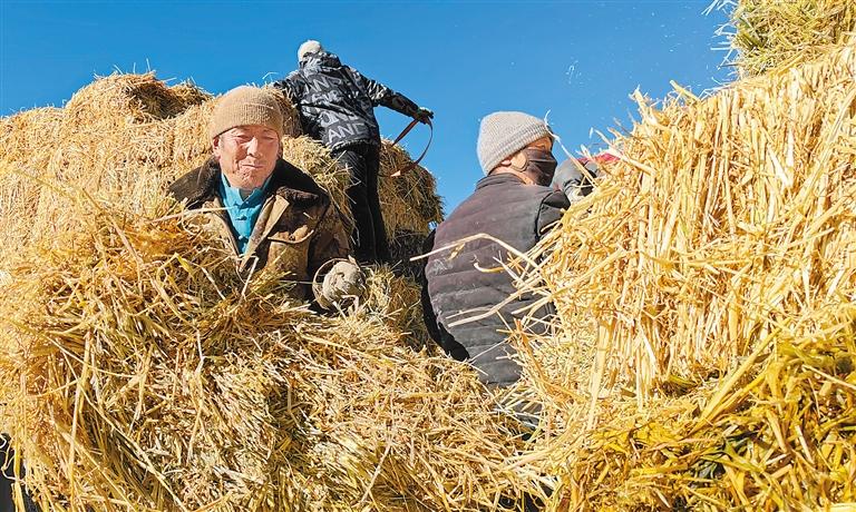 村民們?cè)谛遁d飼草。記者 姚聞 攝