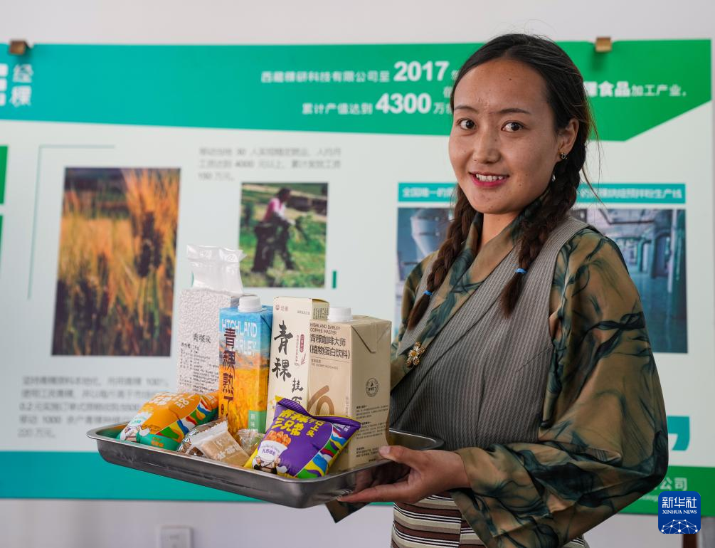 西藏稞研農(nóng)業(yè)科技有限公司工作人員展示部分青稞產(chǎn)品(10月16日攝)。新華社記者 晉美多吉 攝