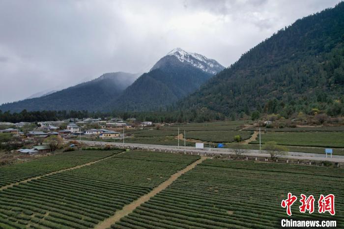 12月13日,西藏林芝波密縣易貢茶場(chǎng)雪山、茶田風(fēng)光。(無(wú)人機(jī)畫面)中新社記者 江飛波 攝