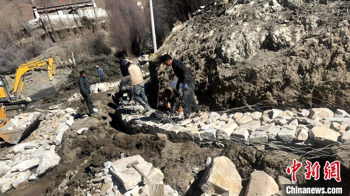 圖為工作隊組織人員加固吐如雄村灌溉水池。工作隊 供圖