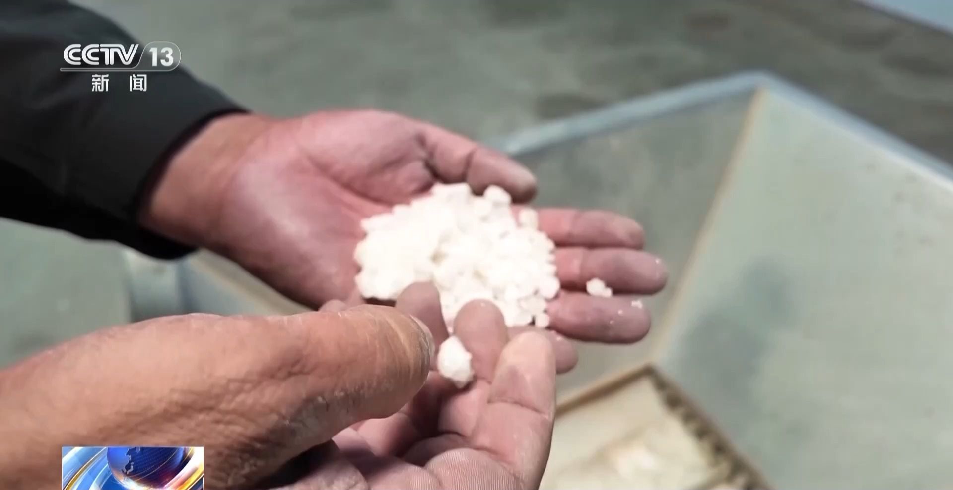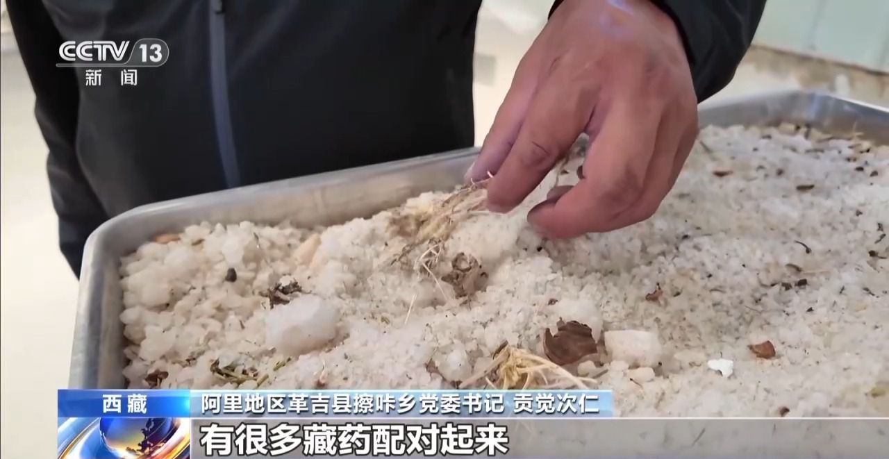阿里地區(qū)革吉縣擦咔鄉(xiāng)黨委書記 貢覺次仁:這個就是足療鹽的原料,除了鹽以外還有很多藏藥,將原料先做初步的粉碎,然后進行混合,最后磨成跟面粉一樣。