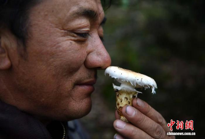 8月28日,扎稱在甘孜州鄉(xiāng)城縣色壩村細嗅松茸?!≈行律缬浾?王磊 攝
