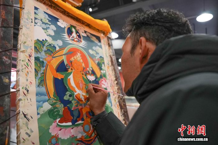 圖為西藏鄉(xiāng)村振興產(chǎn)品展示中心內(nèi)的唐卡繪制體驗區(qū)。貢確 攝