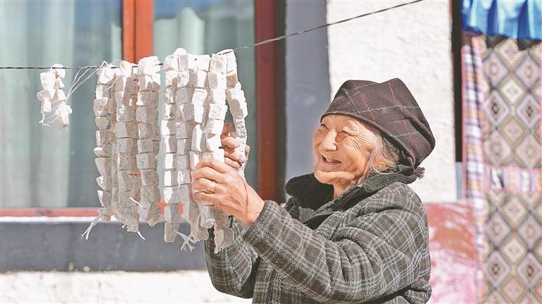 墨竹工卡縣日多鄉(xiāng)拉龍村一位老人在晾曬奶渣。