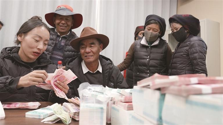 勞務(wù)公司工作人員正在給村民發(fā)工資。