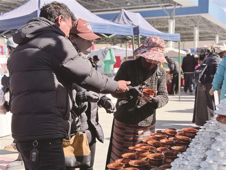 參展商戶們?cè)缭鐐浜秘浳铮谡刮磺懊β到哟?,不少人首日就收獲滿滿。不丹籍商戶扎西已是第二年參展,去年10萬(wàn)元貨物售罄的好業(yè)績(jī)讓他今年信心倍增,帶來(lái)價(jià)值30萬(wàn)元-40萬(wàn)元的8個(gè)品種的產(chǎn)品,“物交會(huì)的人氣一年比一年旺,去年結(jié)識(shí)的本地合作伙伴今年還來(lái)進(jìn)貨,加上今年有物流補(bǔ)貼和線上推廣,我的木碗能賣到更遠(yuǎn)的地方,太省心了。”加查縣商戶群培帶著自家手工制作的木碗連續(xù)參展20年,開幕僅一個(gè)多小時(shí)就入賬3000余元,他感慨道:“從跟著父親來(lái)擺攤到如今有了固定展位,物交會(huì)越辦越規(guī)范,如今不僅僅是本地顧客認(rèn)可我們的手藝,還有外地游客也會(huì)前來(lái)咨詢購(gòu)買,生意越來(lái)越有奔頭?!?/p>