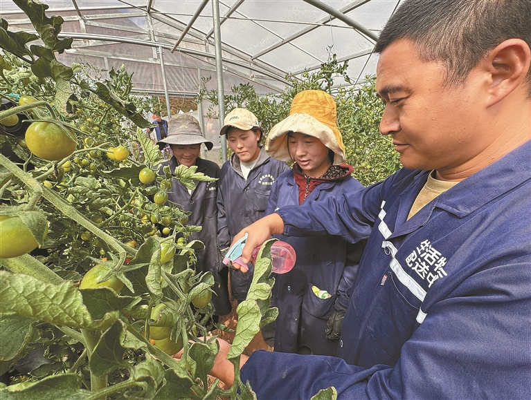 圖為貢覺縣現(xiàn)代農(nóng)業(yè)產(chǎn)業(yè)園的技術(shù)員向當(dāng)?shù)鼐蜆I(yè)青年教授小番茄種植技術(shù)。記者 白瑪澤旺 次仁平措 攝