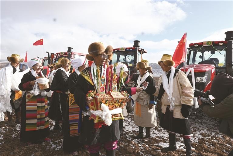 緊隨其后,翻土機、整土機、碎土機依次發(fā)動,轟鳴聲響徹田間,鐵犁滾滾翻起新泥,現(xiàn)代農機的高效與傳統(tǒng)耕作的儀式感相映成趣,勾勒出春堆村農業(yè)發(fā)展的新圖景?!艾F(xiàn)在種地太省心了,通路通電通網(wǎng),無人機播種、施肥都成了常態(tài),再也不用靠蠻力干活。”村民吉吉笑著說,更讓大家安心的是,自從和西藏阿拉嘉寶酒業(yè)有限責任公司(以下簡稱西藏阿拉嘉寶酒業(yè))搭上了線,自家種的青稞再也不愁銷路?!凹Z食能賣上好價錢,心里就有底。”吉吉說。