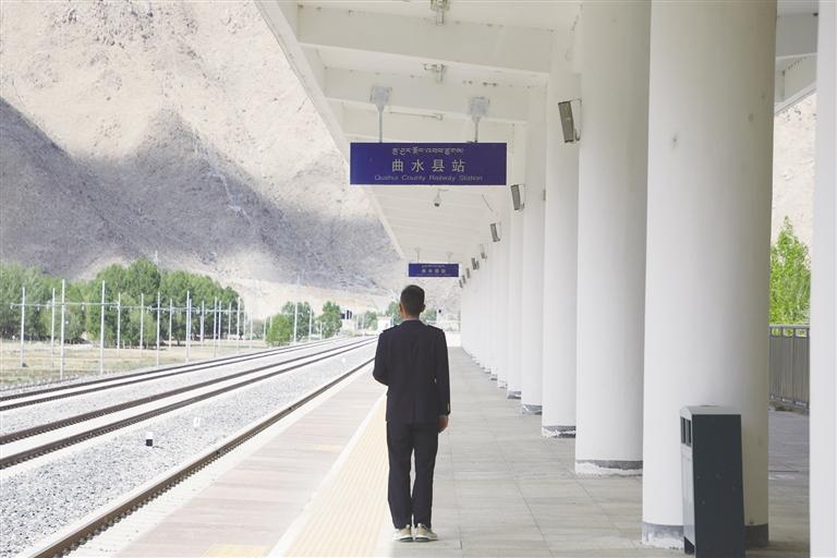 每天,清晨的第一縷陽光還未穿透遠(yuǎn)方的山巒時(shí),車站值班員賀文貴已經(jīng)站在曲水站的站臺(tái)上,開始了他日復(fù)一日的工作,查看股道是否有異物,是否有動(dòng)物進(jìn)入站場。曲水站與其他站不一樣,根據(jù)工作安排,平時(shí)這里只有一個(gè)人當(dāng)班應(yīng)急值守,沒有旅客上下站,時(shí)而駛過的火車,是這里唯一的來客。目之所及,只有遠(yuǎn)處的雪山、農(nóng)田和滾滾向前的雅魯藏布江水。