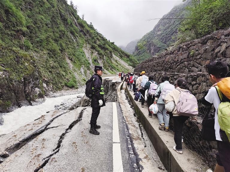 “我是本地人,對(duì)這里山體結(jié)構(gòu)熟,這段路落石多,須快速通過(guò)?!泵鎸?duì)腳下100米落差的奔涌山洪,該大隊(duì)日屋邊境派出所輔警洛入不時(shí)向大家提醒著。面對(duì)惡劣的自然環(huán)境,每名隊(duì)員心里只有一個(gè)信念:爭(zhēng)分奪秒趕往人員滯留地點(diǎn)。