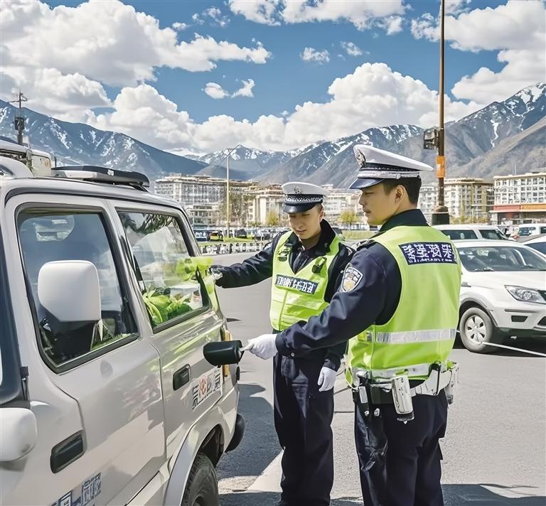 民警對(duì)過(guò)往的車輛進(jìn)行檢查。圖由拉薩交警提供