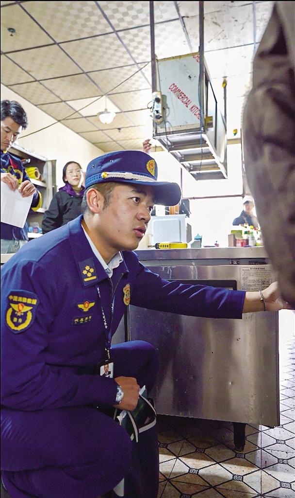 消防人員檢查餐飲店防火設(shè)施器材是否完好。