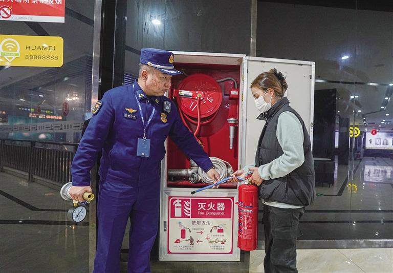 消防人員檢查華美巨幕影城滅火器配置數(shù)量。