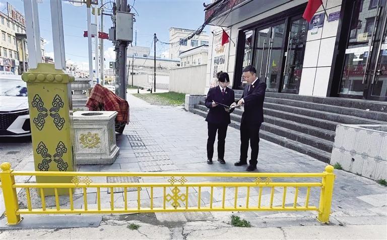 工作人員正在檢查路邊盲道存在的問(wèn)題。通訊員 才仁拉珠 攝