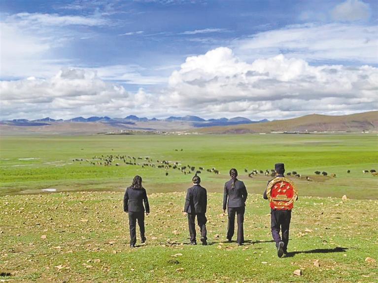 在廣袤的草原深處,牧民群眾的黑帳篷與成群的牛羊構(gòu)成人與自然和諧共生的畫卷。措美縣人民法院干警來到放牧點(diǎn),圍坐于牧民群眾間,用通俗易懂的語言打開話匣子?!按笫澹催@草場上的植被,要是過度放牧,來年就長不出這么好的草了,牛羊沒了口糧,咱們的日子也受影響不是?”