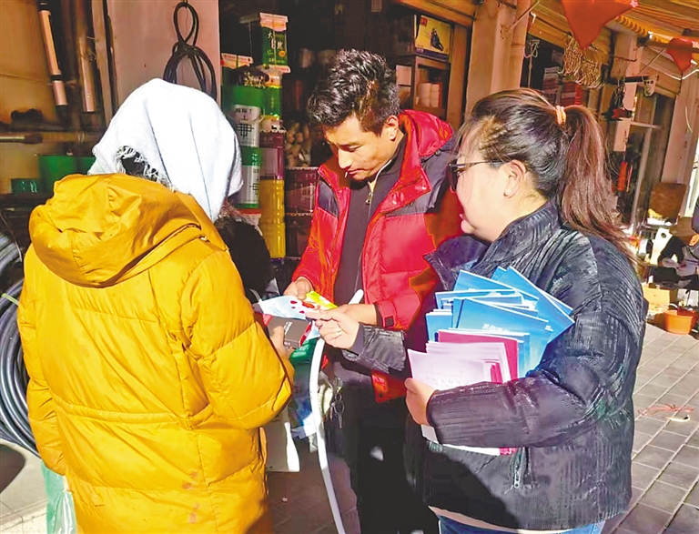 墨竹工卡縣群團(tuán)工作部婦聯(lián)工作人員走進(jìn)商戶發(fā)放反家庭暴力宣傳手冊(cè)。記者 格桑倫珠 攝