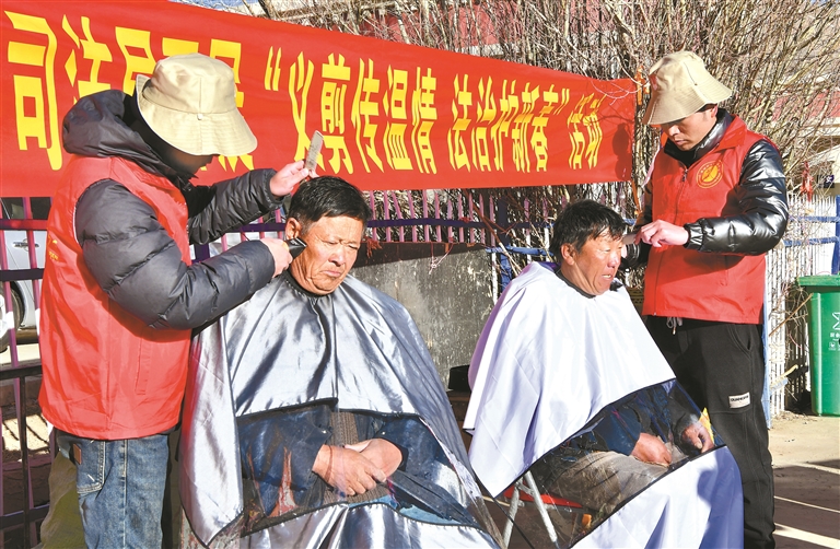 圖為志愿者為村民義務(wù)剪發(fā)。