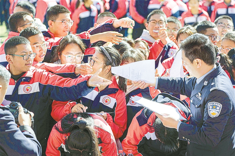 圖為西藏“開學第一課”網絡普法進校園活動中,民警為學生發(fā)放普法宣傳知識手冊(資料圖片)。記者 貢曲羅杰 攝