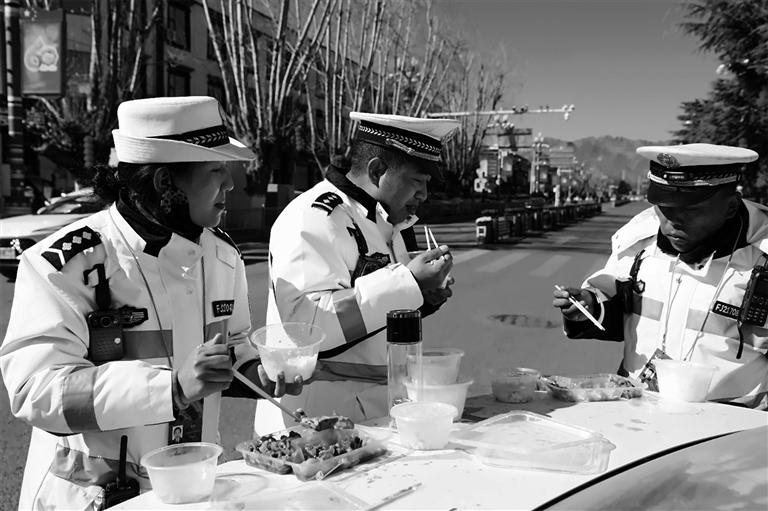 圖為交警在執(zhí)勤路口簡(jiǎn)易用餐。圖由日喀則交警提供