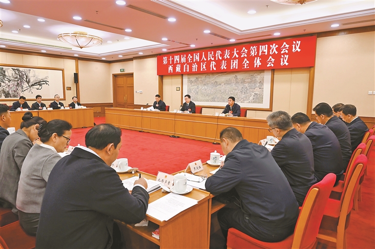 西藏代表團(tuán)團(tuán)長、自治區(qū)黨委書記王君正主持并講話。西藏代表團(tuán)副團(tuán)長、自治區(qū)黨委副書記、自治區(qū)人大常委會(huì)主任嚴(yán)金海,西藏代表團(tuán)副團(tuán)長、自治區(qū)黨委副書記、自治區(qū)主席嘎瑪澤登參加。
