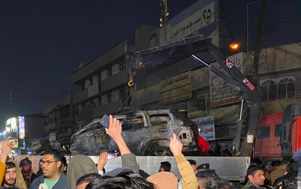 2024年2月7日,在伊拉克首都巴格達,民防部門轉移遭無人機襲擊的車輛。新華社發(fā)(哈利勒·達伍德攝)