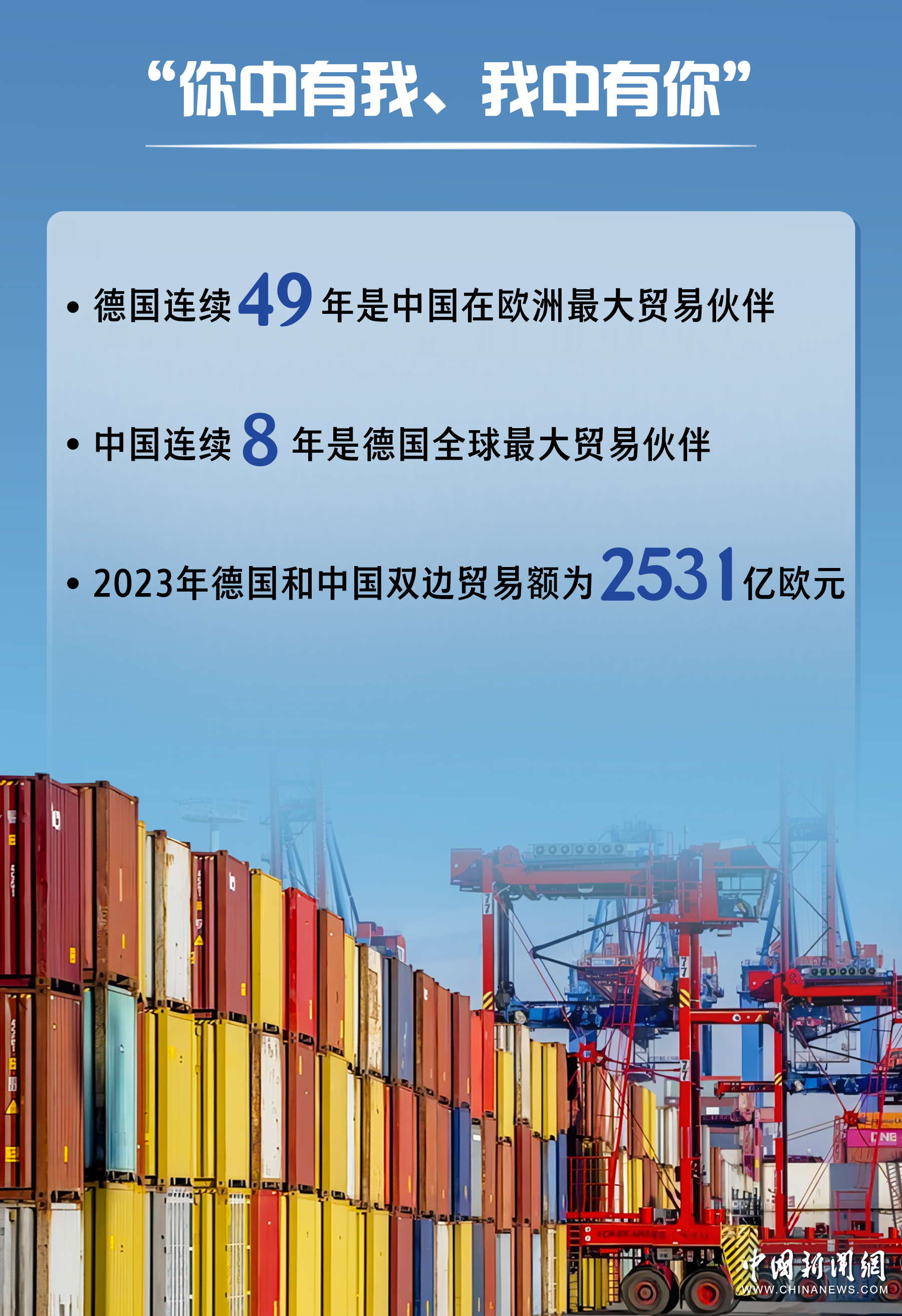 根據(jù)德國聯(lián)邦統(tǒng)計局?jǐn)?shù)據(jù),2023年德國和中國雙邊貿(mào)易額為2531億歐元,中國已連續(xù)8年成為德國全球最大貿(mào)易伙伴。德國連續(xù)49年是中國在歐洲最大貿(mào)易伙伴。
