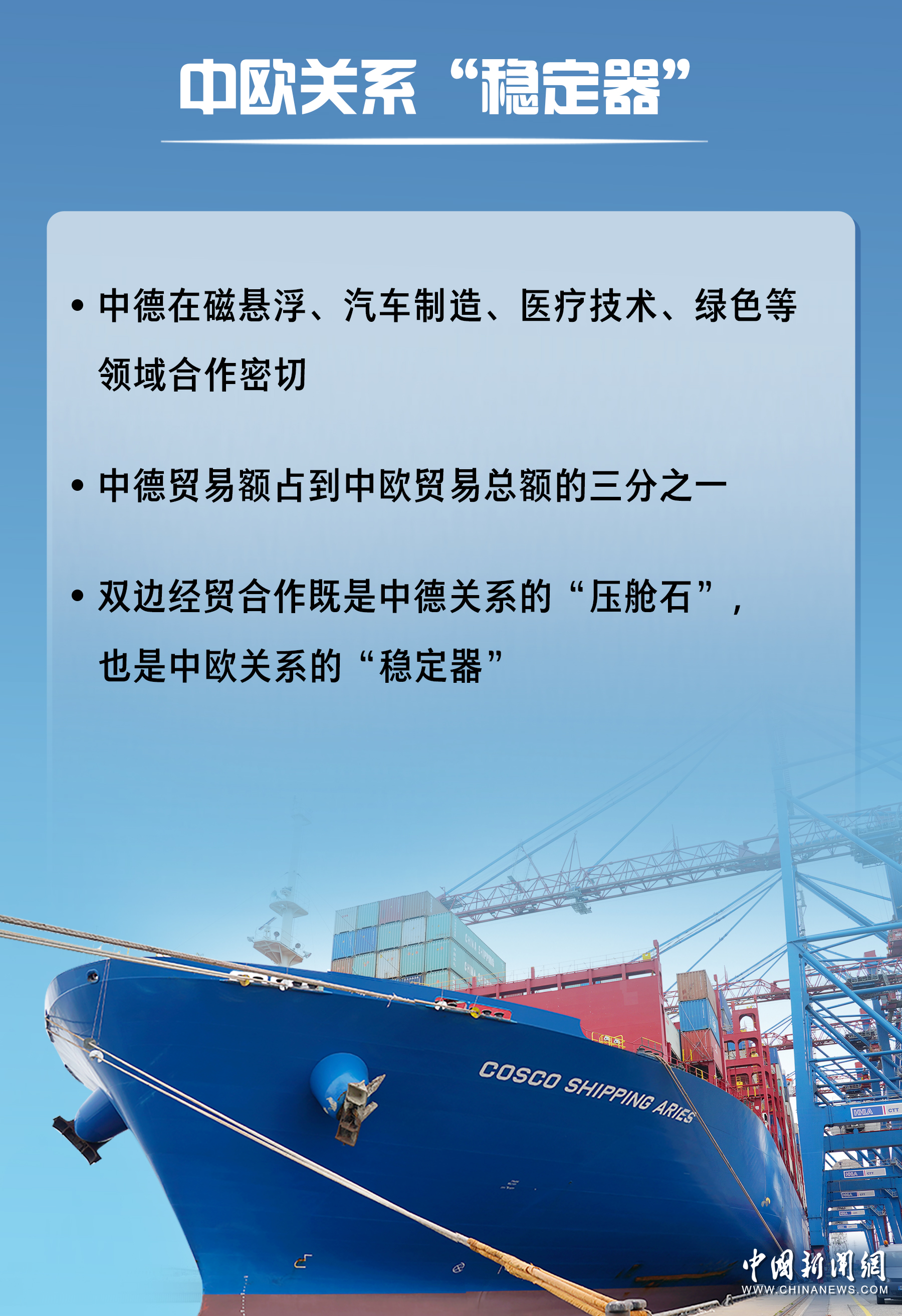 當(dāng)前,中德貿(mào)易額占到中歐貿(mào)易總額的三分之一,德國對華投資占到歐盟對華投資的三分之一,雙邊經(jīng)貿(mào)合作既是中德關(guān)系的“壓艙石”,也是中歐關(guān)系的“穩(wěn)定器”。