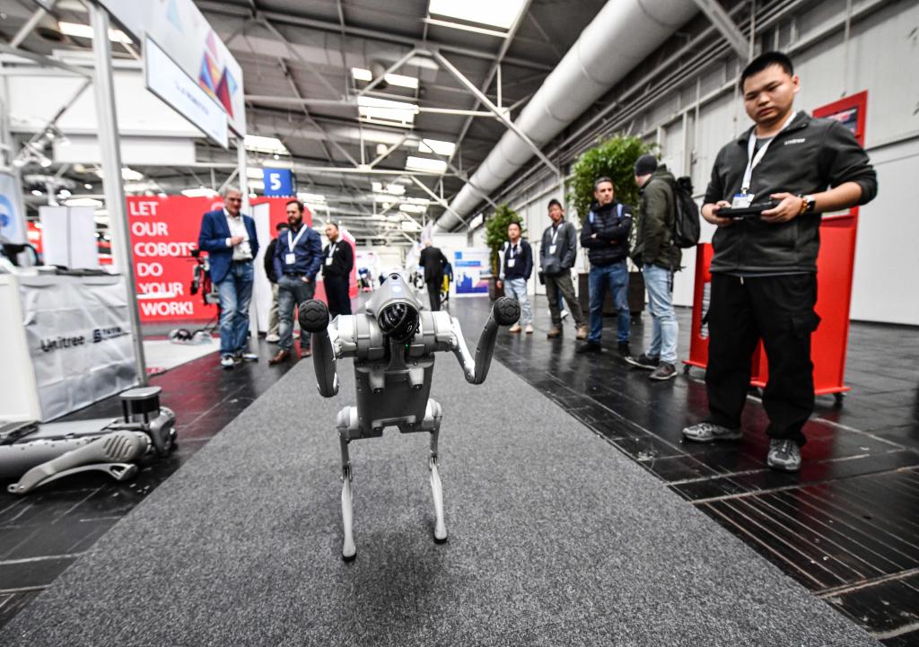4月22日,在德國漢諾威工博會上,杭州宇樹科技有限公司參展商(右一)在展示一款機(jī)器狗。新華社記者任鵬飛攝