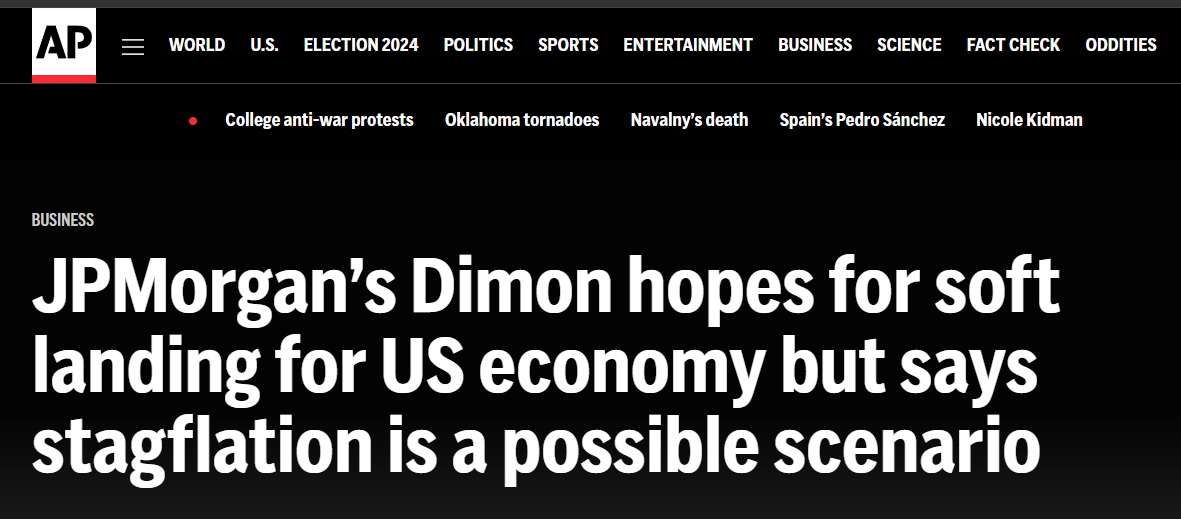 近日,摩根大通公司首席執(zhí)行官杰米·戴蒙在接受美聯(lián)社采訪時(shí)稱,他對(duì)美國(guó)經(jīng)濟(jì)仍保持“審慎”,并表示通脹可能會(huì)在更長(zhǎng)時(shí)間內(nèi)變得更棘手,“滯脹也可能是(美國(guó)經(jīng)濟(jì)面臨的)一種情況”。