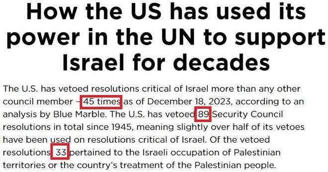 根據(jù)美國智庫"芝加哥全球事務(wù)委員會(huì)"的統(tǒng)計(jì),截至2023年12月18日,美國否決批評以色列的安理會(huì)決議的次數(shù)比任何其他安理會(huì)成員國都多,為45次。自1945年以來,美國總共否決了89項(xiàng)安理會(huì)決議,這意味著,超半數(shù)的否決權(quán)被用于批評以色列的決議。而在被否決的決議中,有33項(xiàng)涉及以色列對巴勒斯坦領(lǐng)土的占領(lǐng)或巴勒斯坦人的待遇問題。