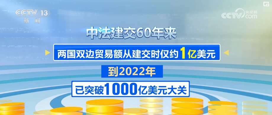 中法建交60年來,兩國雙邊貿(mào)易額從建交時僅約1億美元,到2022年已突破1000億美元大關。如今,法國是中國在歐盟內第三大貿(mào)易伙伴和第三大實際投資來源國,中國則是法國在亞洲第一大貿(mào)易伙伴。