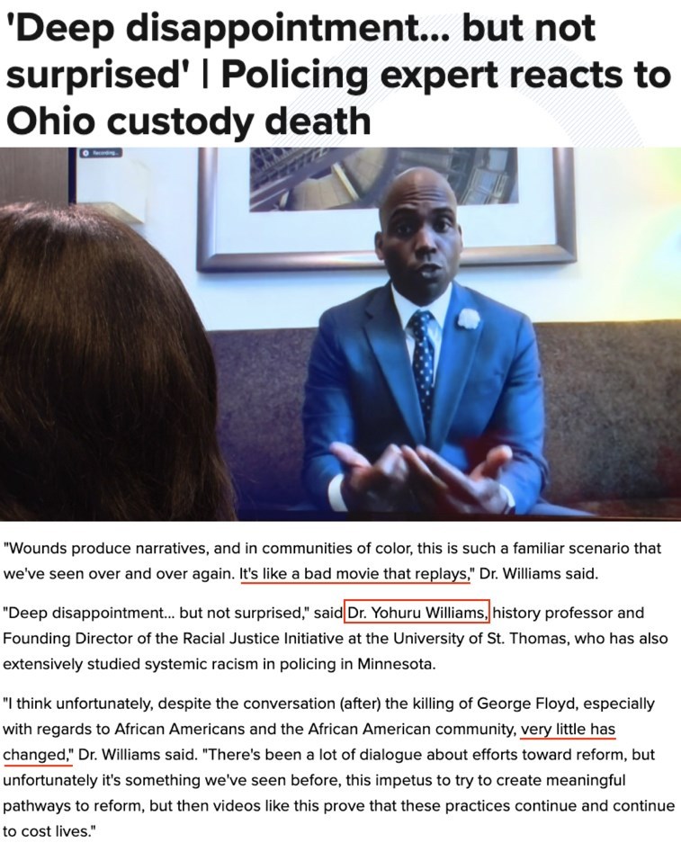 長(zhǎng)期從事種族研究的美國(guó)圣托馬斯大學(xué)歷史學(xué)教授、該校種族正義計(jì)劃發(fā)起人約胡魯·威廉姆斯在接受采訪時(shí)表示,他對(duì)泰森遇害深感失望,但并不驚訝。