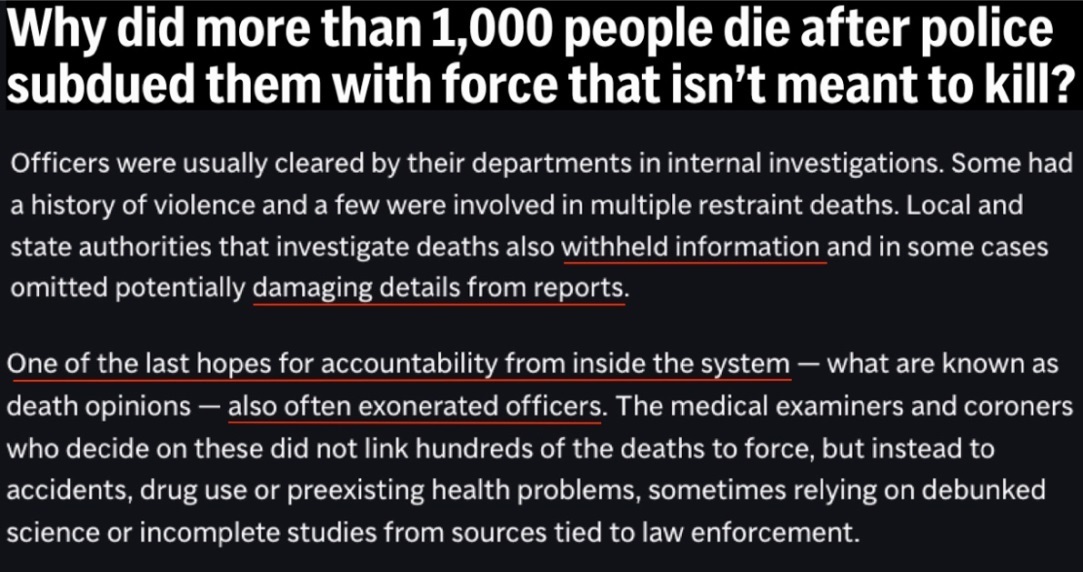 美聯(lián)社不久前主導(dǎo)的一項(xiàng)調(diào)查發(fā)現(xiàn),在2012年至2021年的十年間,美國(guó)警察使用身體約束、電擊、毆打等所謂“非致命性手段”導(dǎo)致至少1036人死亡,平均每周兩人。