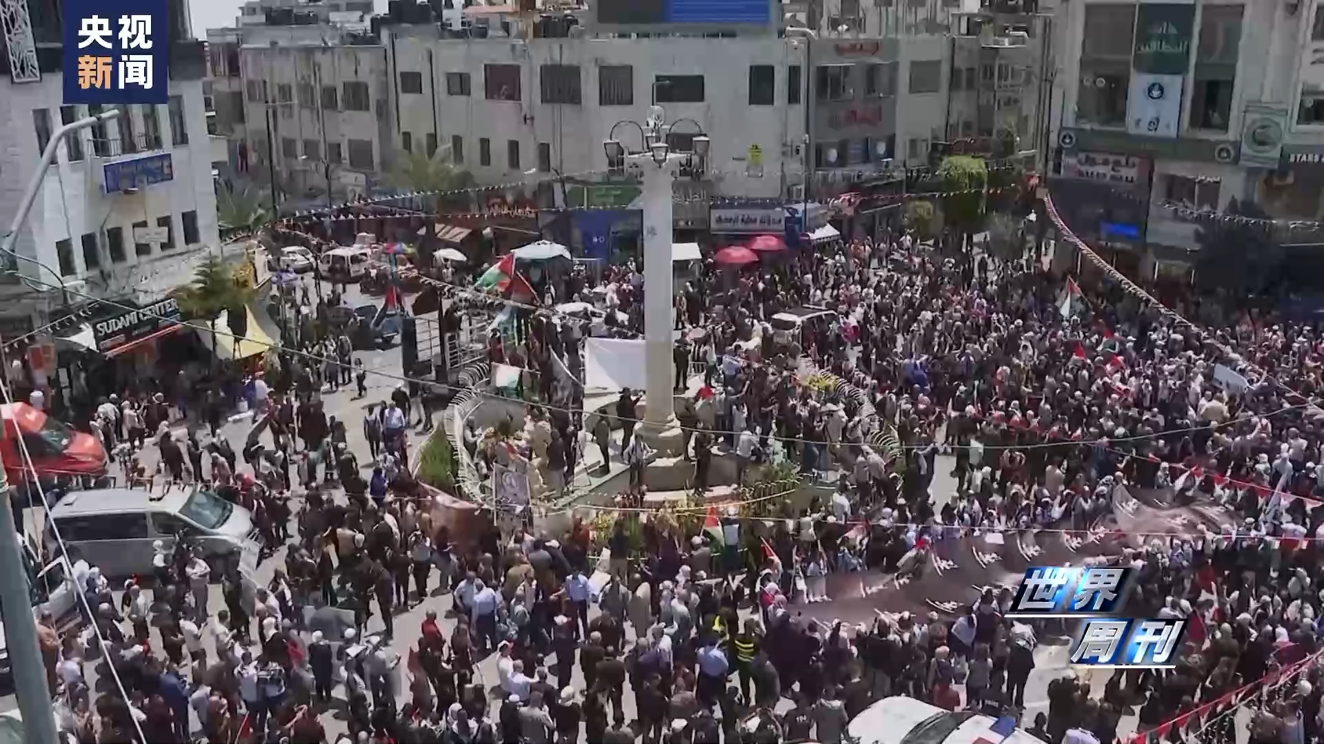 5月15日當(dāng)天,約旦河西岸城市拉姆安拉,數(shù)千名民眾參與游行,他們高舉象征巴勒斯坦人民回歸權(quán)的鑰匙和象征沾滿鮮血的援助物資的道具,高呼口號,要求結(jié)束以色列占領(lǐng)以及巴勒斯坦人回歸故土。