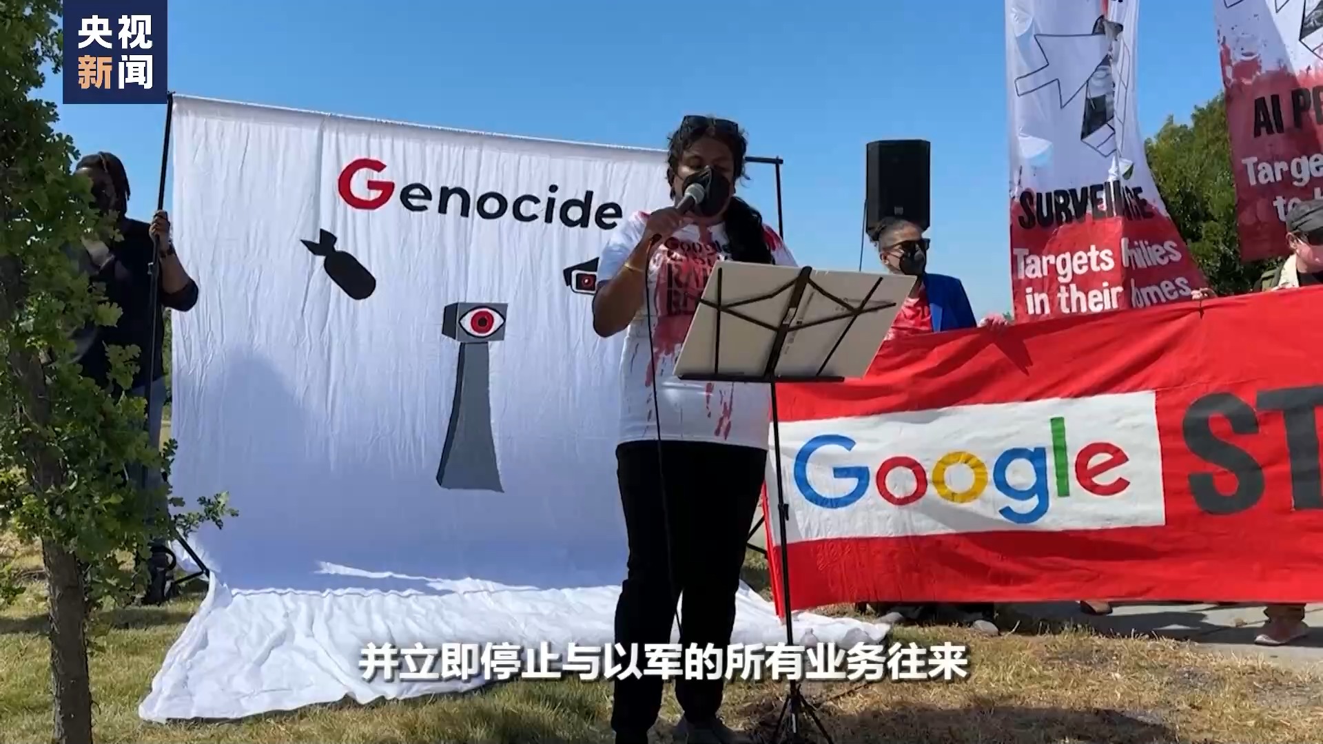 5月14日,美國加州芒廷維尤。在谷歌公司的年會會場外,一些人正在對谷歌參與以色列政府的“光輪計劃”表示強(qiáng)烈抗議。