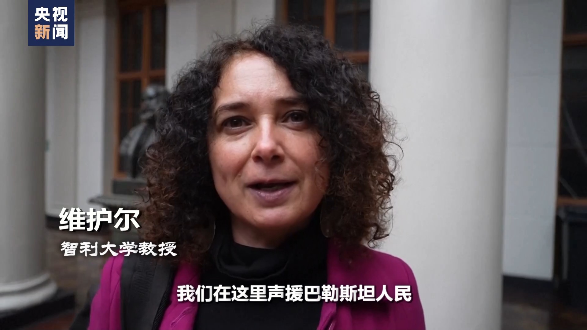 智利大學(xué)教授 維護(hù)爾:我們在這里聲援巴勒斯坦人民,并譴責(zé)針對平民,尤其是婦女兒童所進(jìn)行的人權(quán)侵犯。