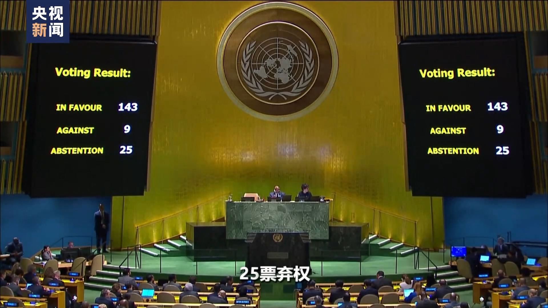 聯(lián)合國大會主席 丹尼斯·弗朗西斯:表決結(jié)果如下:143票贊成,9票反對,25票棄權(quán)。