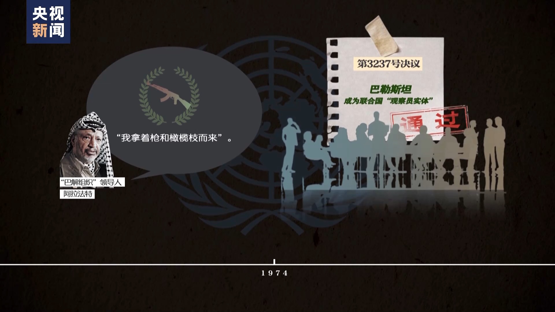 就在這次大會上,“巴解組織”領(lǐng)導(dǎo)人阿拉法特說出了那句著名的“我拿著槍和橄欖枝而來”。