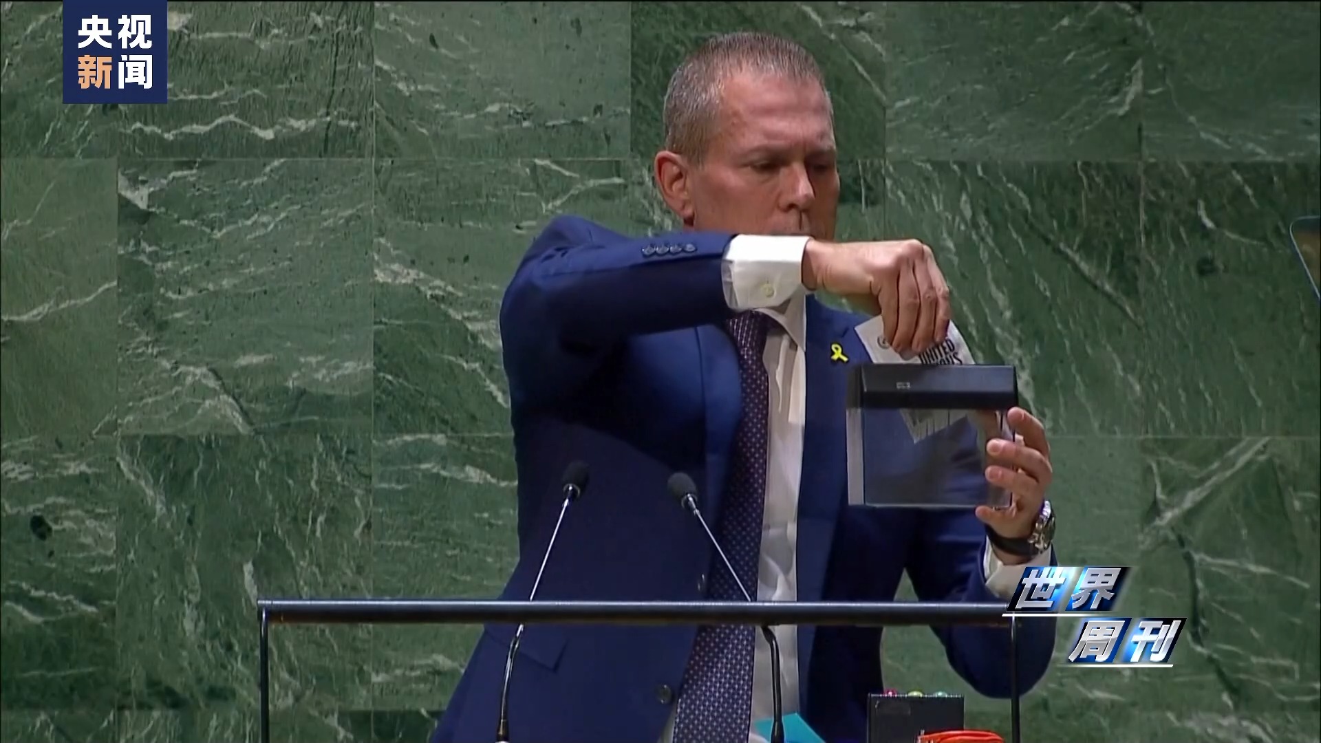 值得一提的是,聯(lián)大會場上還出現(xiàn)了驚人的一幕:以色列常駐聯(lián)合國代表埃爾丹掏出小型碎紙機(jī),將《聯(lián)合國憲章》封面插入其中當(dāng)眾粉碎。