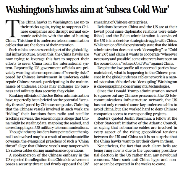 海底光纜是全球數(shù)字基礎(chǔ)設(shè)施的基礎(chǔ)組成部分。對華鷹派們正利用這一點大做文章,為自己試圖把中國從全球體系中分離的行徑找理由。據(jù)報美國政府一些官員已私下向電信運營商們發(fā)出警告,稱讓中國參與海底光纜維修可能會引發(fā)“安全風(fēng)險”,并稱參與海底光纜維護的中國船只可能“危及美國商業(yè)和軍事數(shù)據(jù)安全”。