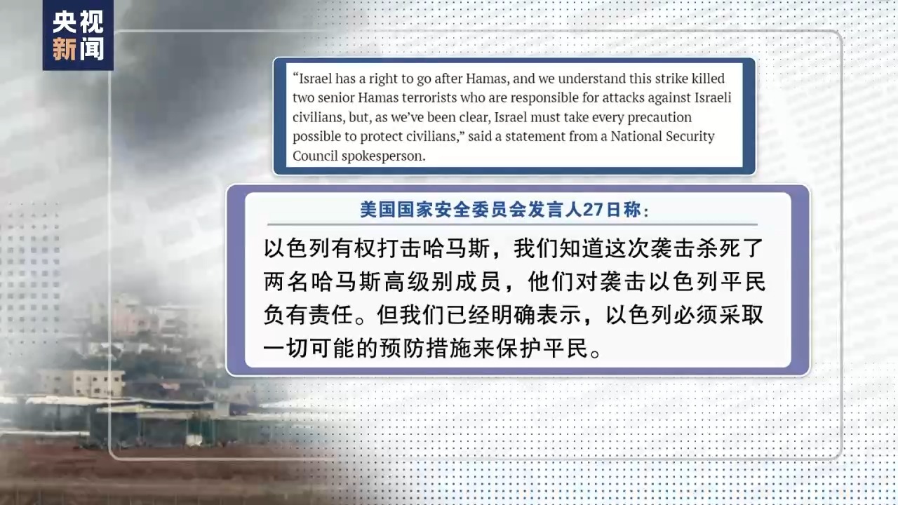 美國國家安全委員會發(fā)言人27日稱:以色列有權(quán)打擊哈馬斯,我們知道這次襲擊殺死了兩名哈馬斯高級別成員,他們對襲擊以色列平民負有責任。但我們已經(jīng)明確表示,以色列必須采取一切可能的預(yù)防措施來保護平民。