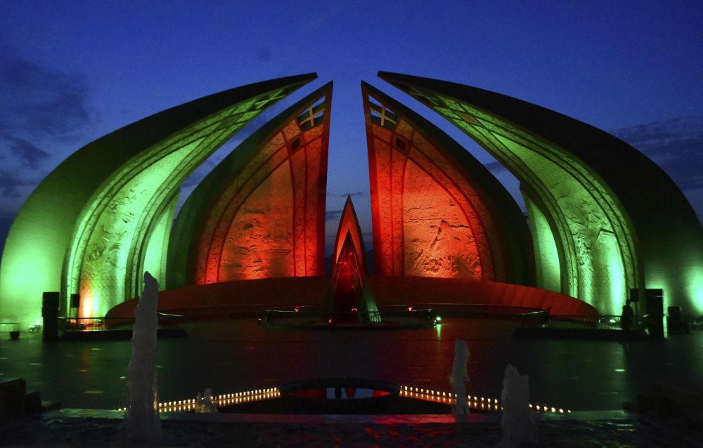 2023年7月29日,巴基斯坦首都伊斯蘭堡的巴基斯坦紀(jì)念碑亮起中巴兩國國旗顏色的燈光,慶祝中巴經(jīng)濟(jì)走廊啟動(dòng)十周年。新華社發(fā)