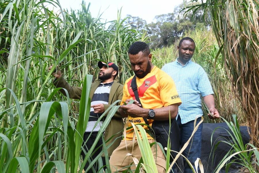 2024年3月28日,在位于福州的福建農(nóng)林大學(xué),來自盧旺達(dá)和巴布亞新幾內(nèi)亞的學(xué)生在“國際菌草苑”內(nèi)查看菌草長勢。新華社記者 林善傳 攝