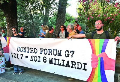 6月14日,在意大利法薩諾,抗議者打出“你們只有七個,我們是八十億人”的標語,批評七國集團與世界完全割裂。新華社記者 李京攝