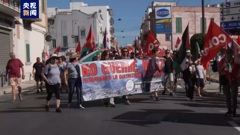 示威者在七國集團峰會舉辦地法薩諾市舉著反對戰(zhàn)爭的標(biāo)語