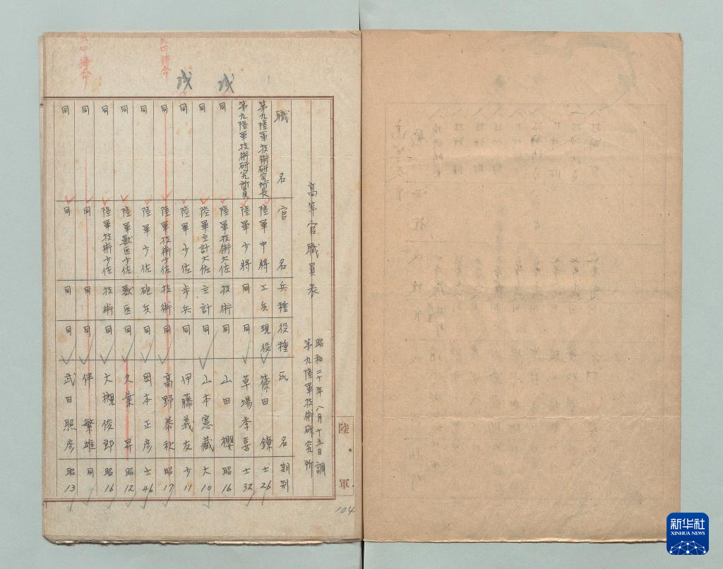 這是日本國立公文書館藏《陸軍第九陸軍技術(shù)研究所高等官職員表(1945年8月15日制)》原始檔案首頁。新華社發(fā)(受訪者供圖)